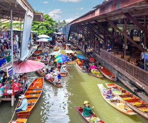 Experience the unique charm of Thai markets where vendors sell fresh produce and local delicacies from boats.